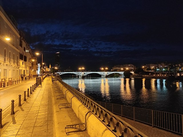A medida que la ciudad se iluminaba, los puentes, las fachadas y las torres comenzaron a destacar de manera especial. La Torre del Oro brillaba sobre la ribera, la Maestranza se perfilaba con su iluminación tenue y los bares junto al río emitían un resplandor acogedor.