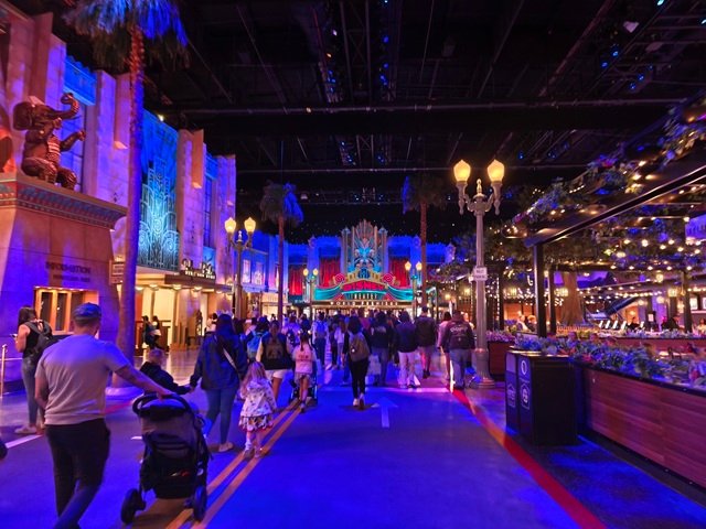 Nada más entrar, te encuentras con World Premiere, una gigantesca nave que simula un estudio de Hollywood. Carteles de películas, tiendas, un restaurante enorme… y un ambiente que te hace sentir dentro de un rodaje. Lo atravesamos sin parar de hacer fotos, y al salir por el otro extremo llegamos a la World Premiere Plaza, donde giramos a la izquierda para entrar en el Avengers Campus.